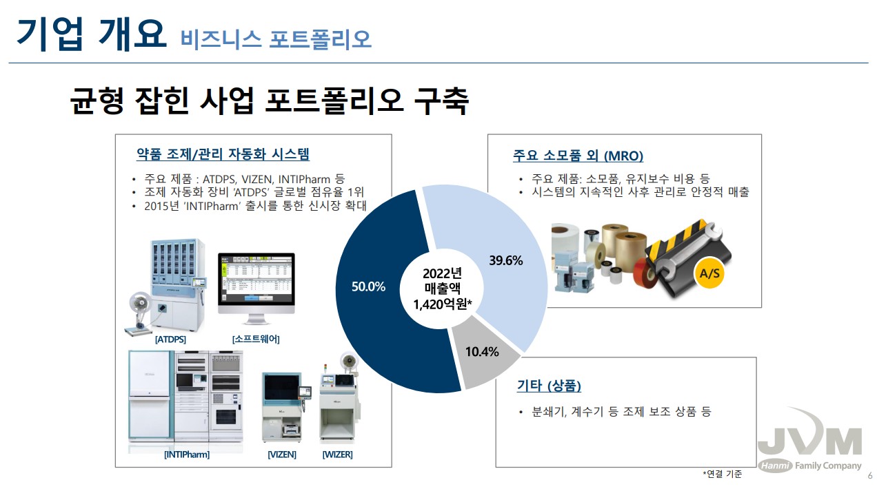 약국 자동화 조제 전문업체로 ATDPS (전자동정제분류포장시스템; Automatic Tablet Dispensing & Packaging System) 글로벌 1위 업체임. 지역별 점유율은 국내 80%, 북미 75%, 유럽 75%임. 매출 액 비중은 ATDPS가 49%, 소모품 매출인 MRO가 38%를 차지함